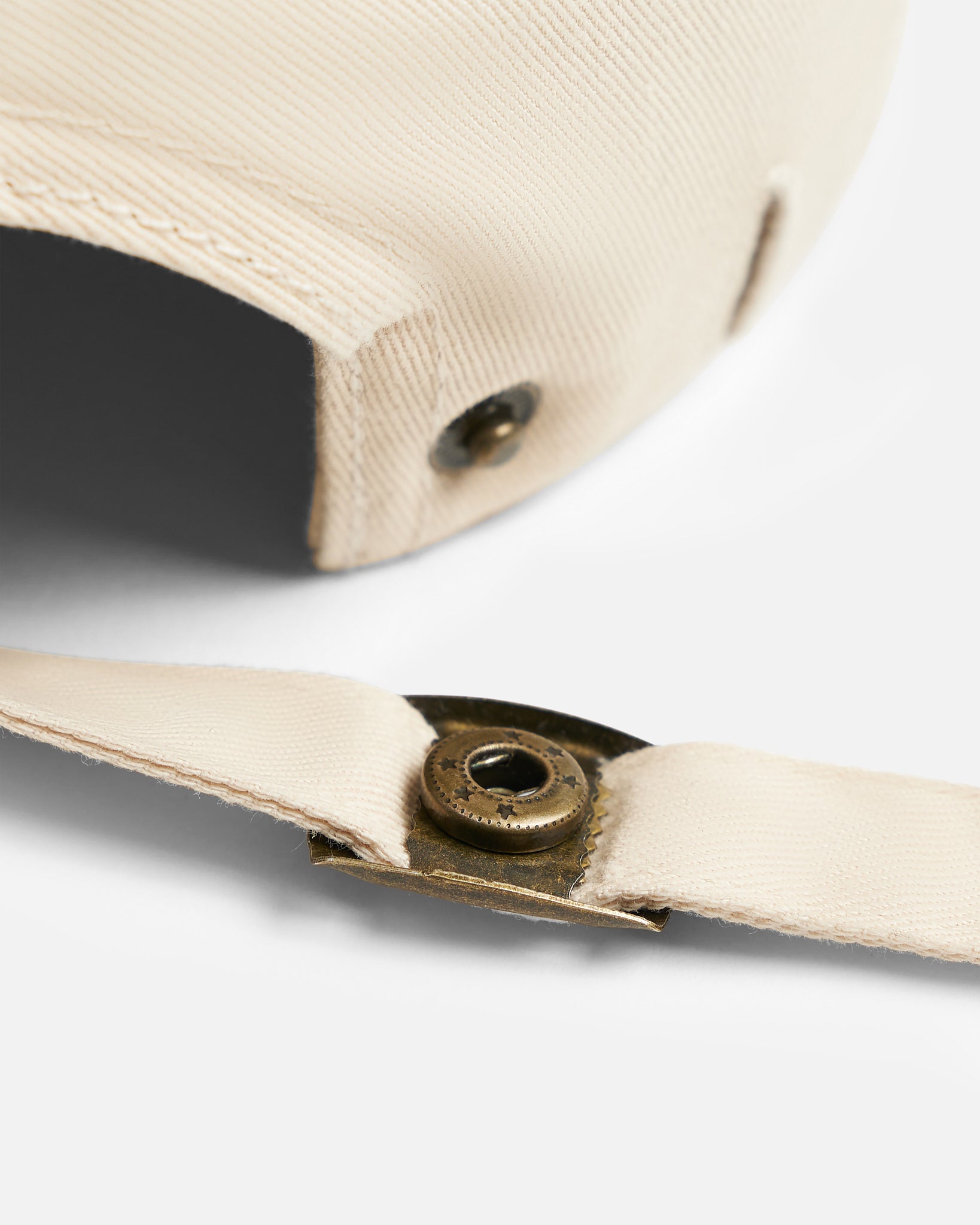 A brand new hat designed with one of our classic logos. It’s a six panel unstructured hat with a flat embroidery motif on the front. Comes in the colors navy & cream.