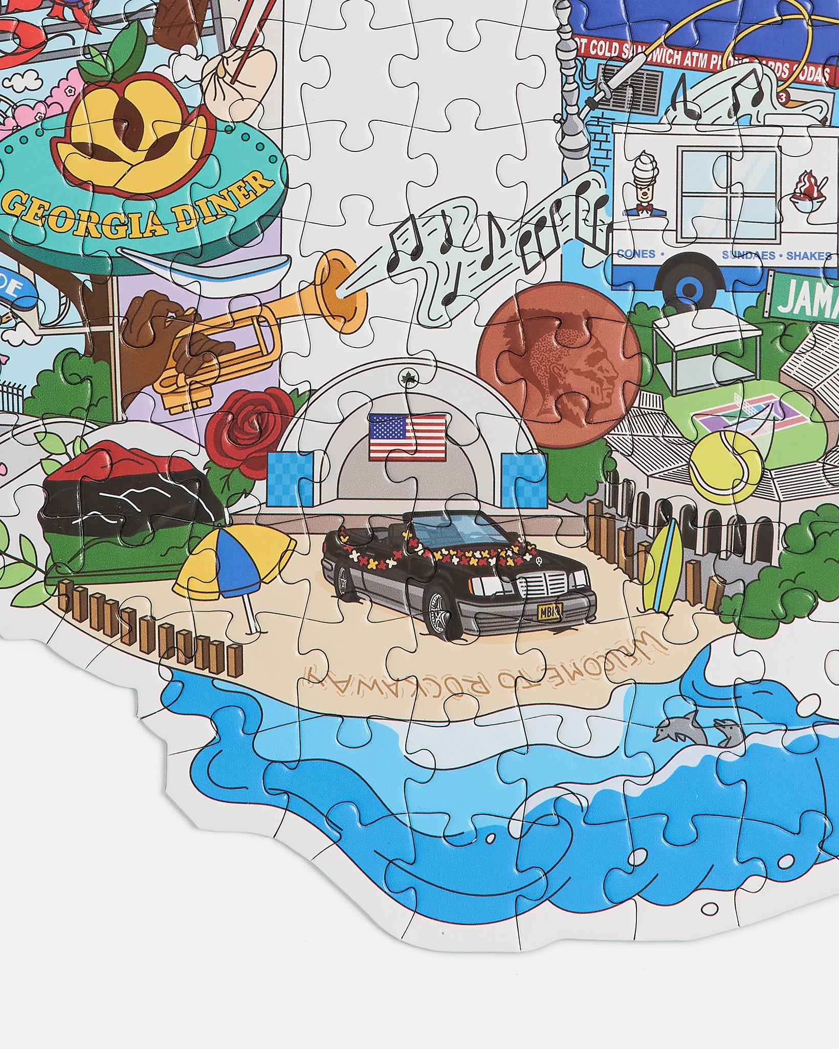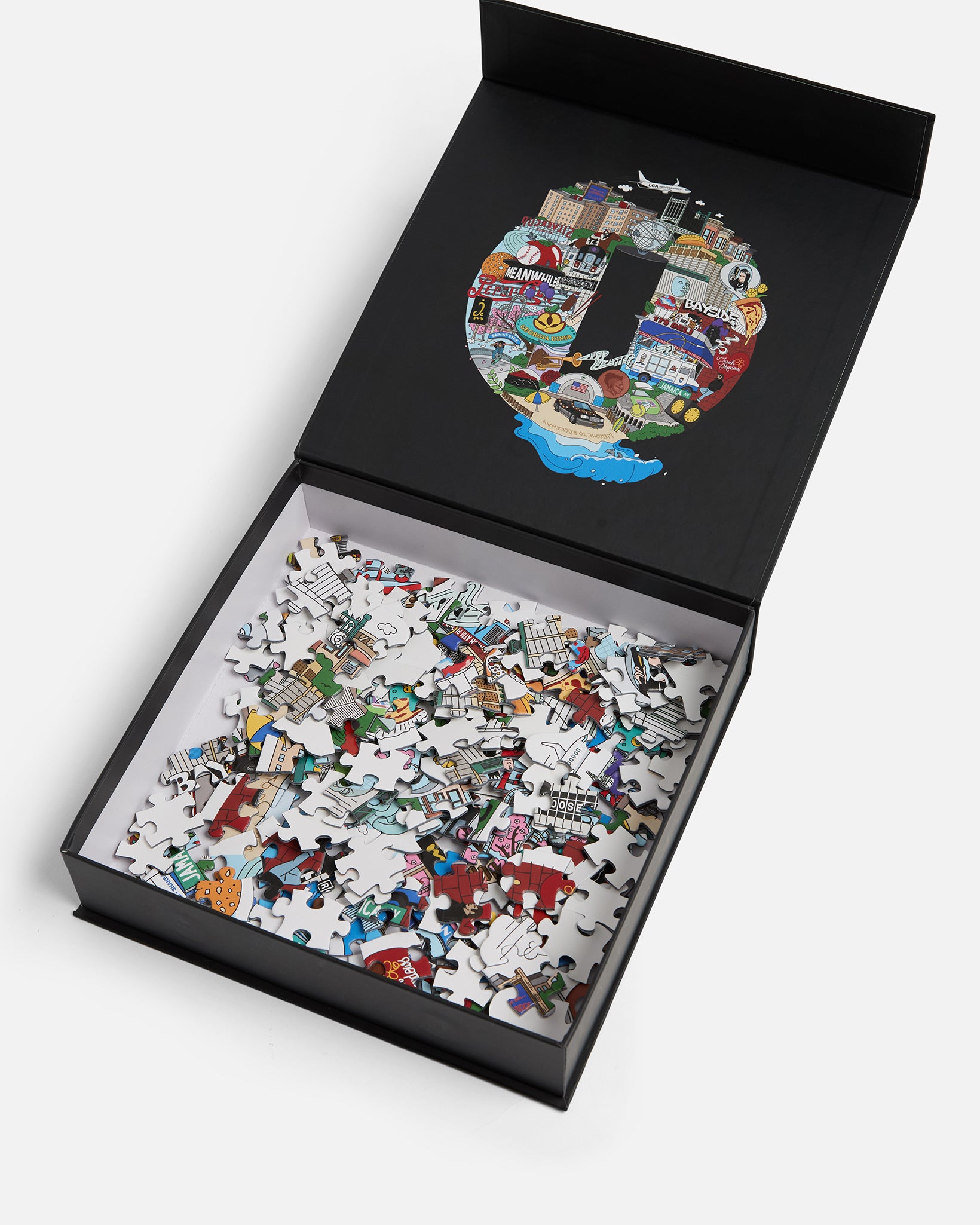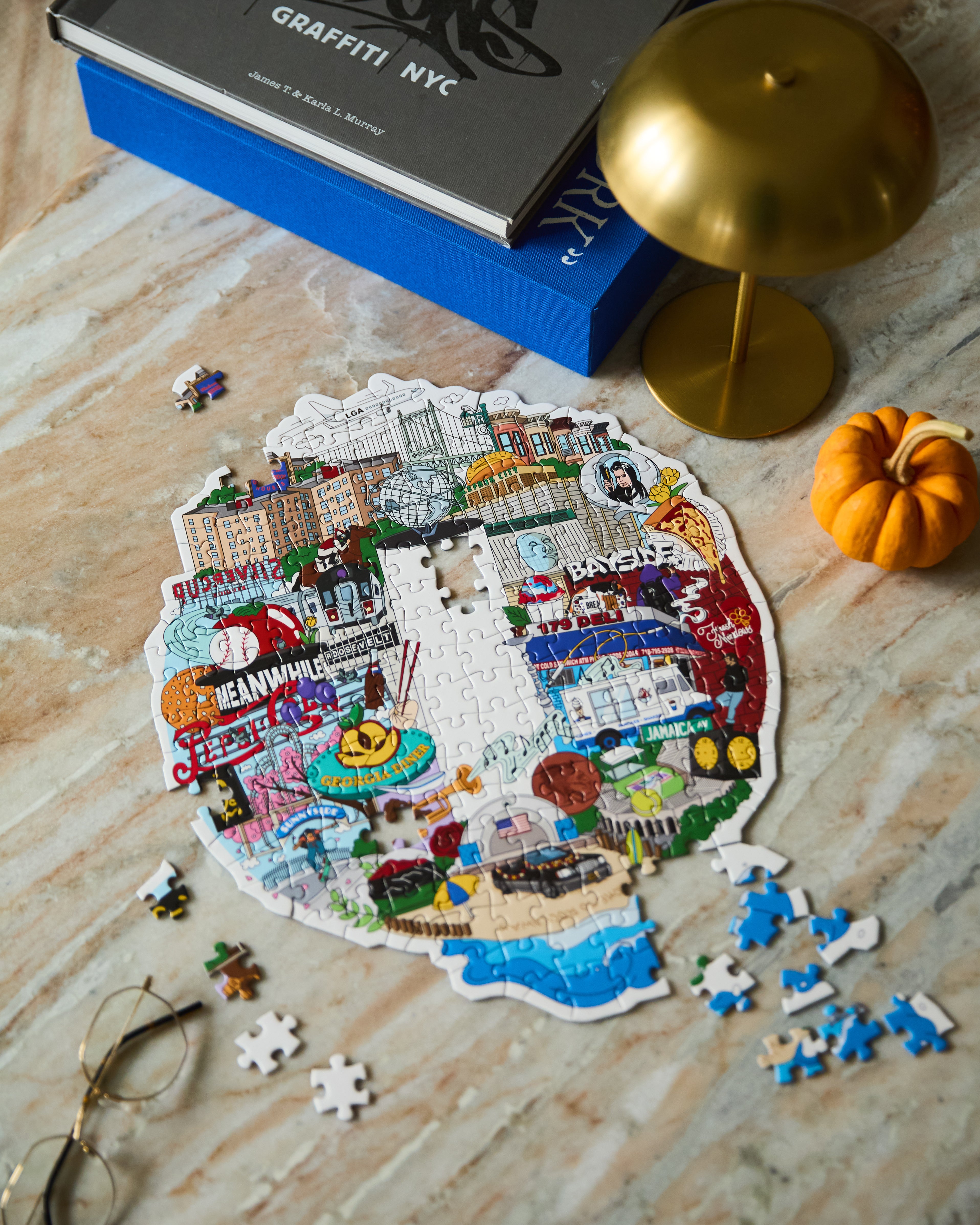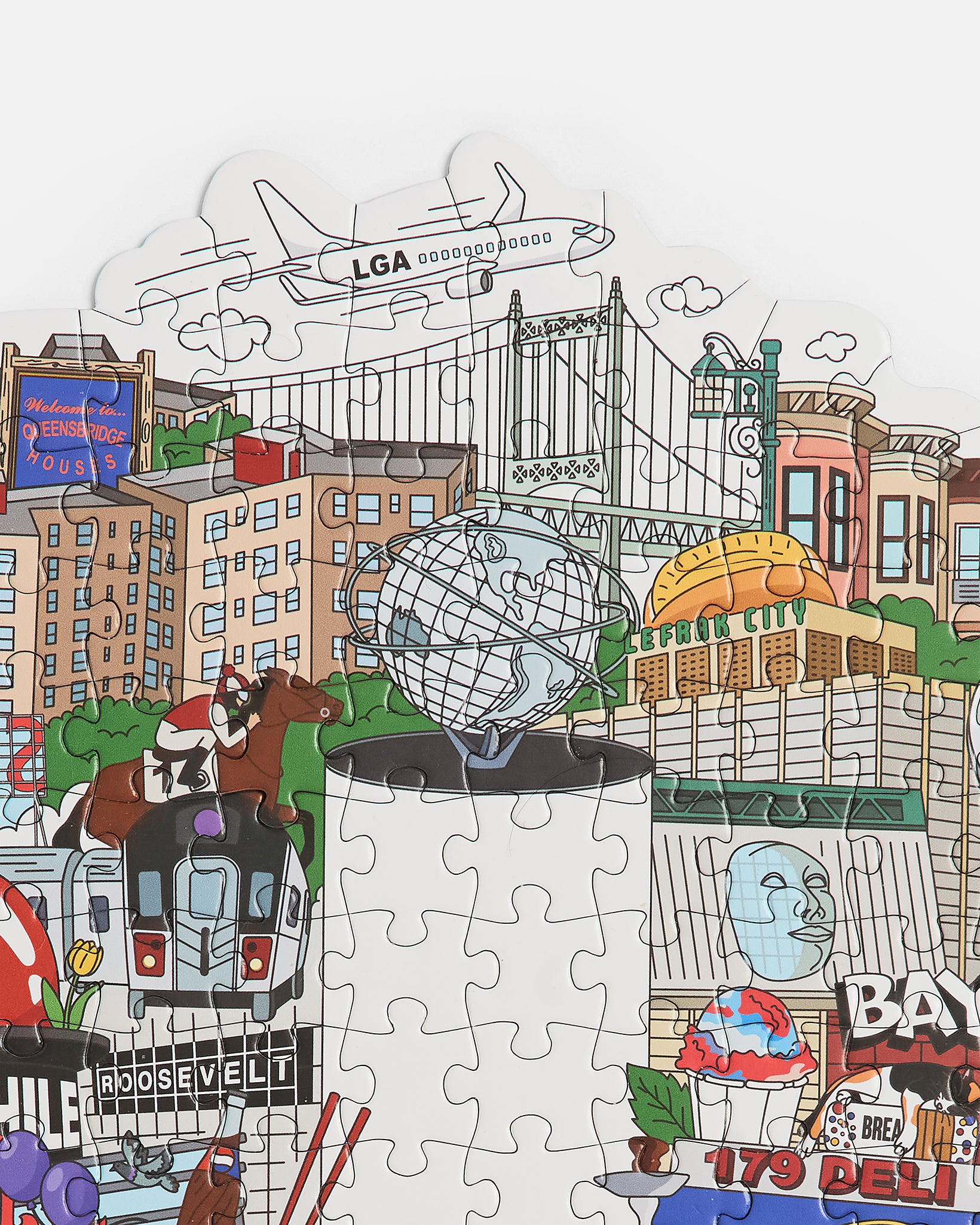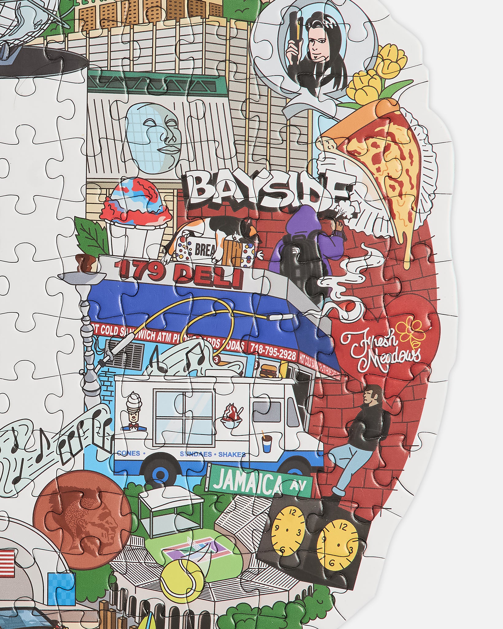 A 200 piece custom collage puzzle of Queens landmarks, icons and neighborhood legends.